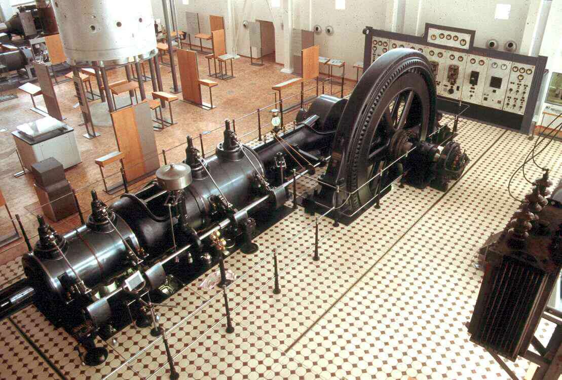 Expansionsdampfmaschine: Fertig wiederaufgebaut im Landesmuseum Mannheim (Blick von der Rampe: links die Zylinder, rechts der Schwungradgenerator)