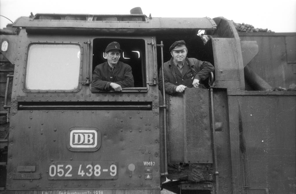 Führerhaus der Dampflok 052 438-9 mit Lokpersonal: Lokführer Rudi Pfau und sein sehr tüchtiger türkischer Heizer; Bf Mülheim (Ruhr)-Speldorf. Rudi Pfau war begeisterter Eisenbahner und Dampflokführer, und ich verdanke ihm viele Impulse und interessante Erlebnisse - so auch diesen großartigen 15.11.1971 durch die ganztägige Mitfahrten auf dem Führerstand der 50 2438 auf Strecken des Ruhrgebiets und am Folgetag die 50er-Fahrt vor einem Personenzug nach Recklinghausen.