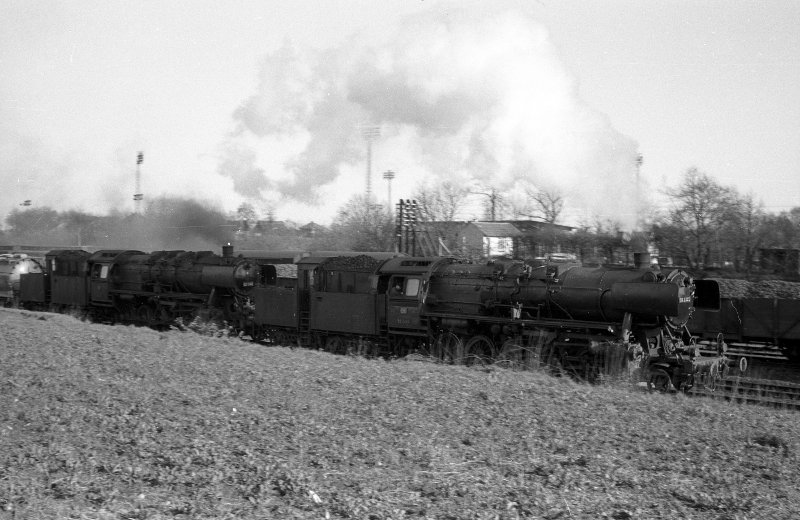 50 2345, vor Güterzug Richtung Münster ub Doppeltraktion (2 x BR 50); Bf Münster Geist Höhe Preußenstadion