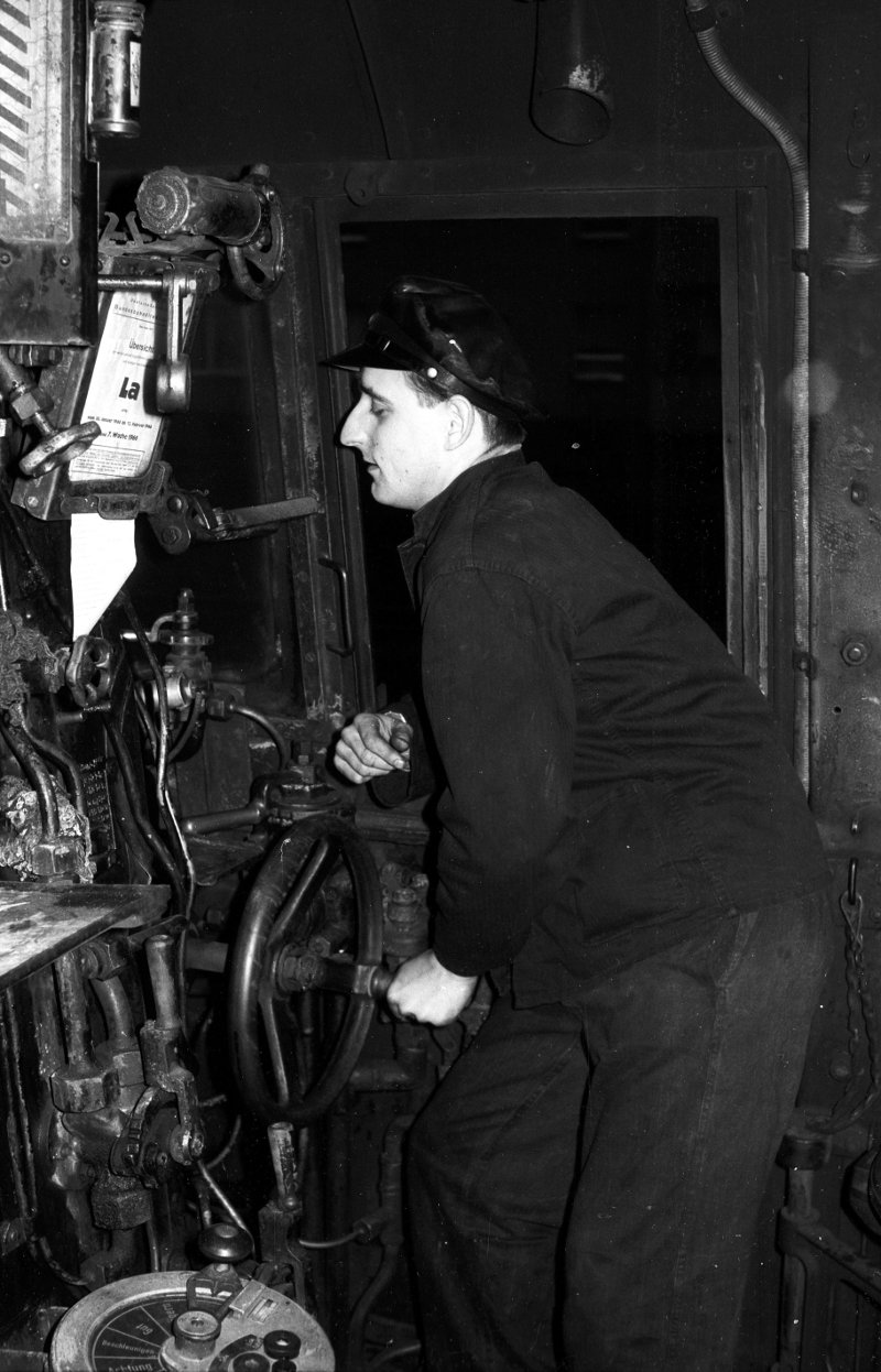 65 018, bei schiebender Fahrt hinter Wendezug, mit Heizer, Essen-Schormebeck; Strecke Düsseldorf - Essen Hbf