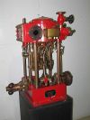 | Beschreibung | Stehende Verbundmaschine mit konzentrischen Zylindern und untenliegender Kurbelwelle zum direkten Antrieb eines Generators; Leistung: 3,5 PS. Der kastenförmige Rahmen (b= 345 mm, t= 330 mm) hat in der Mitte die Kurbelwange und beiderseits die Kurbelwellenlager. In den Ecken sind senkrechte, schmiedeeiserne Stangen (l= 390 mm, D= 25 mm) mit Bünden an den Enden zur Verbindung mit dem einteiligen Zylinderblock. Die beiden hinteren Stangen sind durch ein Messingplatte miteinander verbunden und ausgesteift. Diese Platte enthält drei Gleitbahnen für Marinekreuzköpfe; Abstand: je 70 mm. Die Kurbelwelle ist dreifach gekröpft; die Außen-Kröpfungen sind gegenüber der inneren im 180° versetzt. Eine Kurbelwange ist als Kurbelscheibe ausgebildet und hat Löcher zum Einstecken einer Stange zum Andrehen. Der mittlere Kreuzkopf ist mit dem inneren, kreisförmigen Kolben verbunden und ist kräftiger ausgebildet. Die beiden seitlichen Kreuzköpfe sind mit zwei diametralen Kolbenstangen mit dem ringförmigen Kolben verbunden. Der Zylinder hat entsprechend der Kolbenform und -anordnung kreisförmigen Grundriß und nur einen Zylinderdeckel. Zylinderdurchmesser: Innenzylinder: 79,4 mm, Ringförmiger Zylinder: 98,4/184,2 mm; Hub: 85,7 mm. Rechts ist der Schieberkasten für den Hochdruckteil (Zudampfleitung mit Regulierventil, nach oben gerichtet), links der für Niederdruck (Abdampf-Flansch vorn), beides Flachschieber. Die Exzenter (Messing-Brillen und vierkantige Exzenterstangen) sind außerhalb der Kurbelwellenlager. Die Schieberstangen haben keine Gerdführung. Direkt auf dem ND-seitigen Ende der Kurbelwelle ist ein Kugelregler mit Winkelhebeln und einer Druckfeder auf der Spindel in einer Hülse. Auf der Hochdruck-Seite ist eine dicke Keilriemenscheibe. Die Schmierung erfolgt durch einen Messing-Ölkasten mit acht Dochtölern vor dem Zylinder und einem mit vier Schmierstellen hinter dem Zylinder zu den Kreuzkopf- und Kurbellagern. Hierzu haben die Gabel-Enden der Kurbelstangen oben (am Kreuzkopf) Schlitze, in welche das Ölt tropft; es versorgt die Kreuzkopfbolzen und über Kupferröhrchen an der Stange entlang auch die Kurbellager. Die Kurbelwellenlager haben separate Schmiergefäße. Auf der Unterseite des Zylinders sind Entwässerungshähne für die mittige und die Ringkammer. |